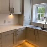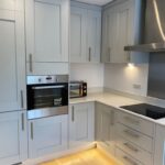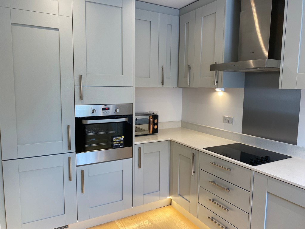 KITCHEN Modern kitchen featuring a range of wall and base units with Quartz worktops, built-in washer/dryer, fridge/freezer, dishwasher, electric fan oven, ceramic hob, and extractor. Includes a Fascino instant boiling water tap and a Fascino curved tap with a clipped hose extension spray.