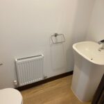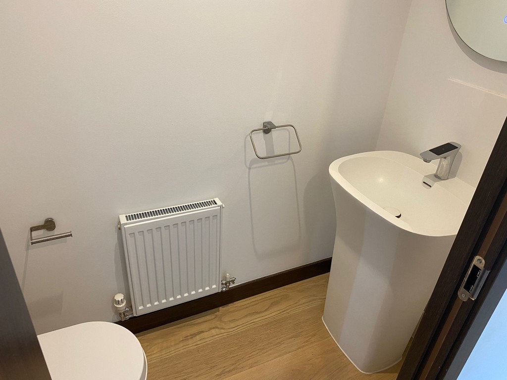 CLOAKROOM A cloakroom with wood flooring, sink and WC.