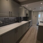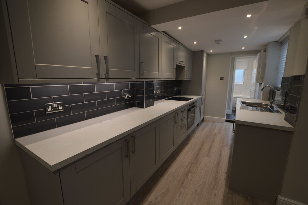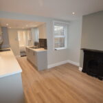 KITCHEN/DINER: MODERN FITTED KITCHEN WITH WOOD FLOORING AND STORAGE CUPBOARDS