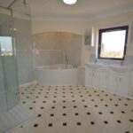 ENSUITE Double shower, ceramic basin and toilet, chrome fittings, and vinyl flooring.