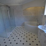 BATHROOM Large bathroom with corner bath, separate shower, bidet, and gold-toned fittings.