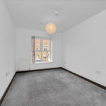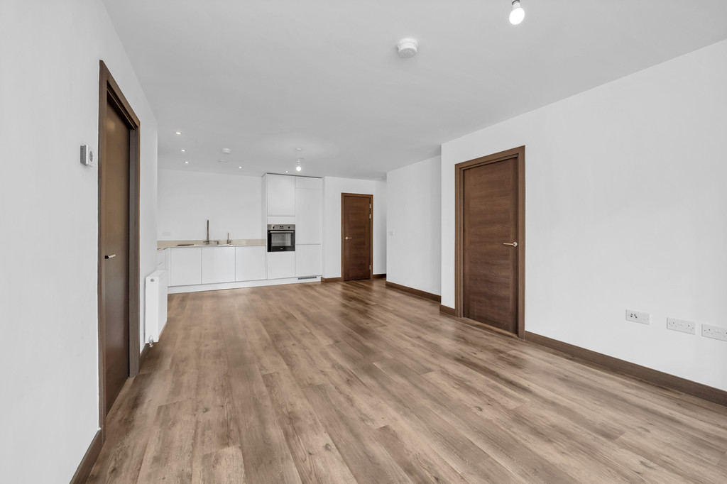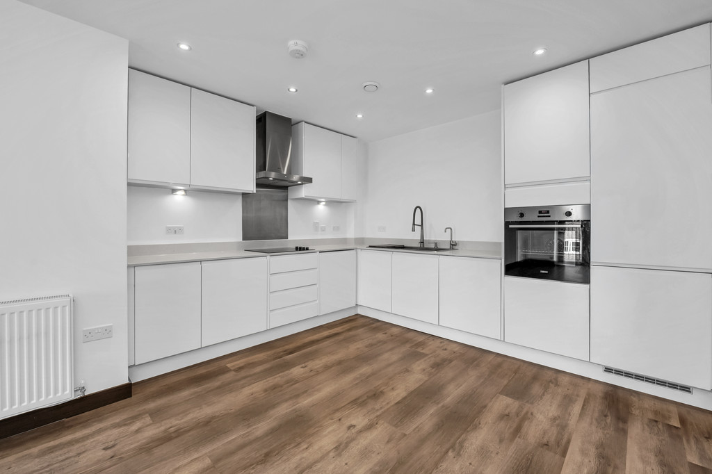 Entrance door into open plan kitchen, dining, living area. The kitchen is fitted with a modern range of light gloss units with integrated fridge freezer, dishwasher, washer dryer, electric oven with electric hob and extractor over. Fascino boiling hot tap and water filter. There is a handy storage cupboard and additional cupboard housing the gas boiler. Patio doors lead out to the balcony.
