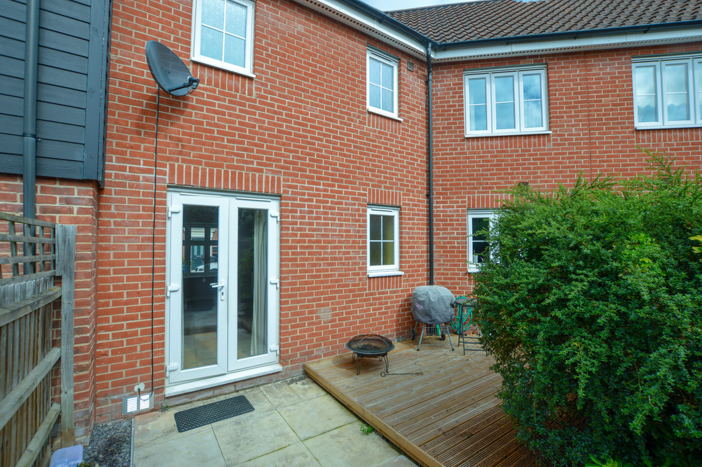 EXTERIOR Front garden with hedges and stone beds, and a paved path leading to the entrance. The rear garden features a decked area and gated side access, with rear access to the allocated parking space. Ample on road parking available.