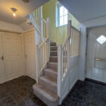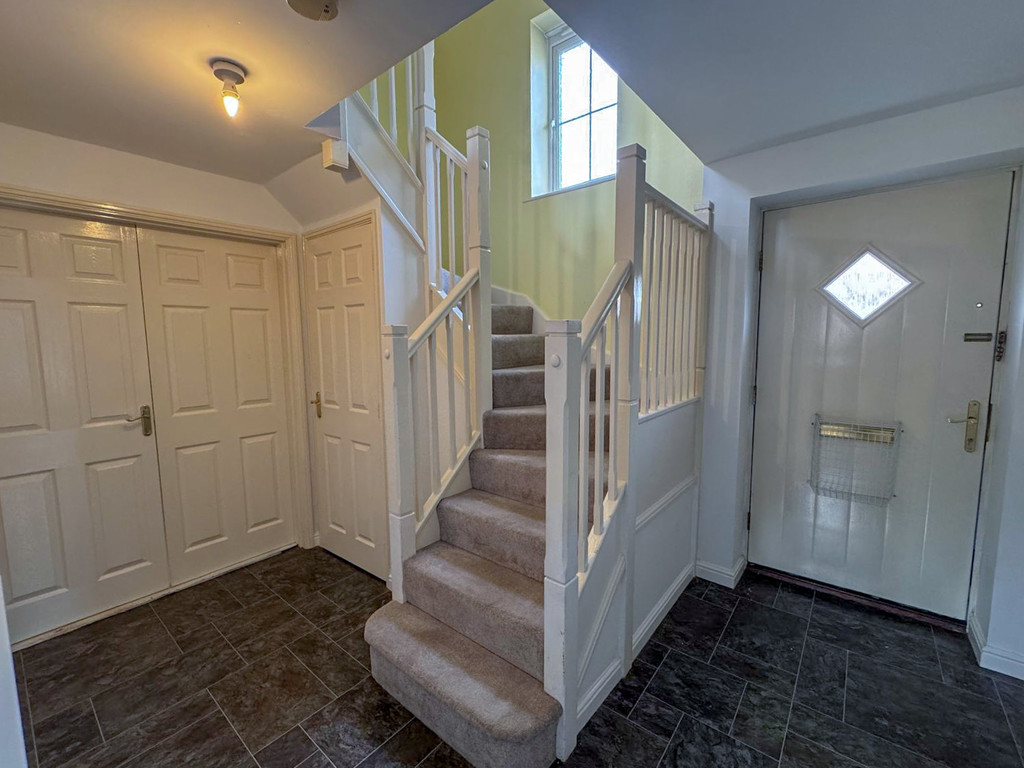 ENTRANCE HALL Spacious entrance hallway featuring high-quality 'Karndean' tiled flooring, a plastered ceiling with overhead lighting, and a built-in storage cupboard. Stairs lead to the first floor.