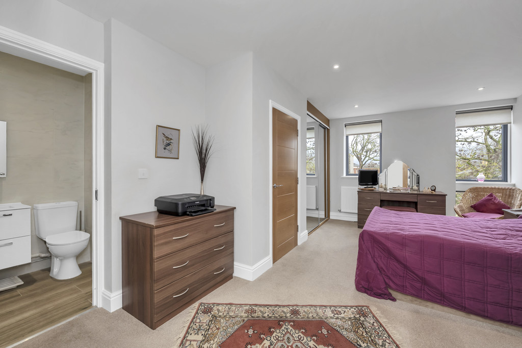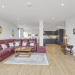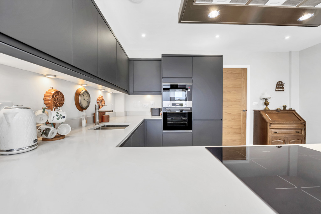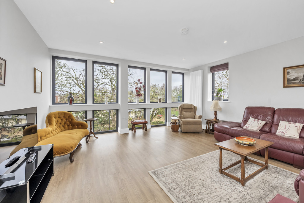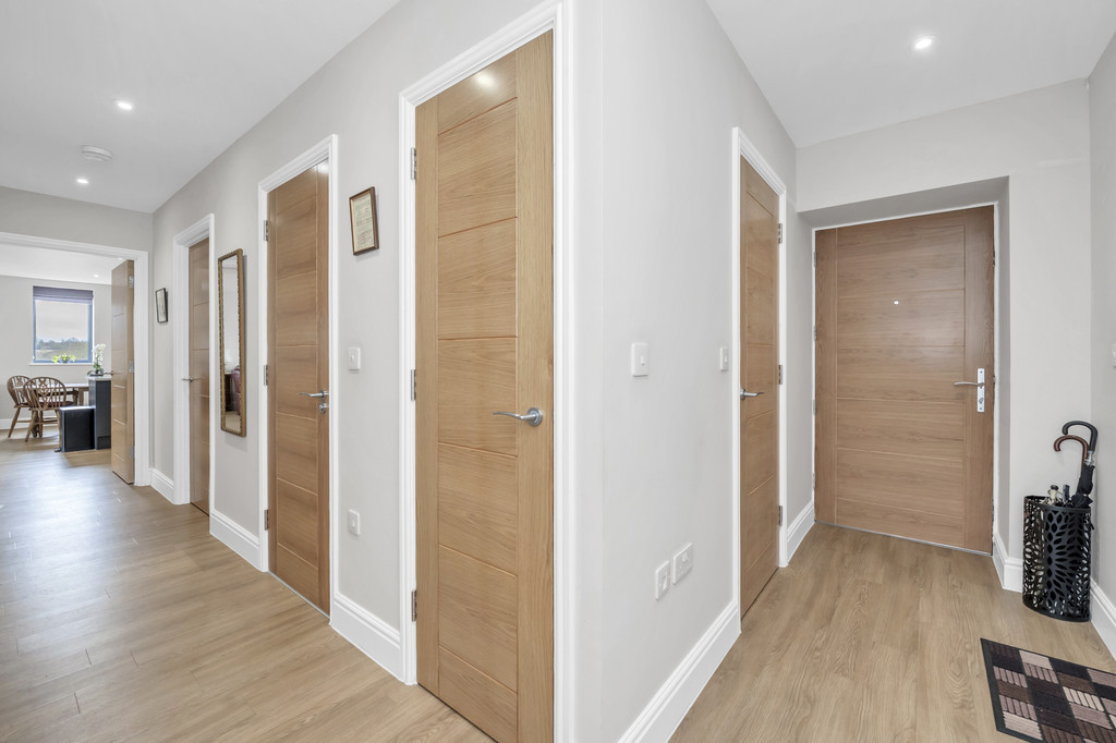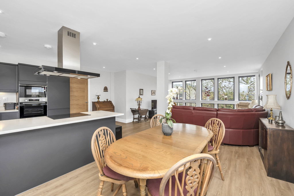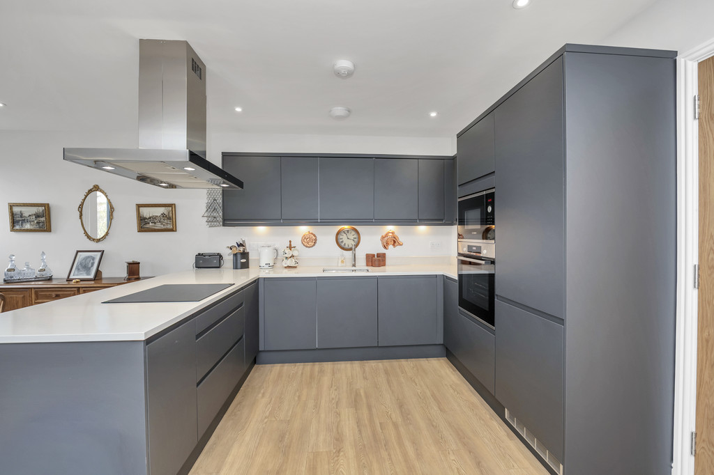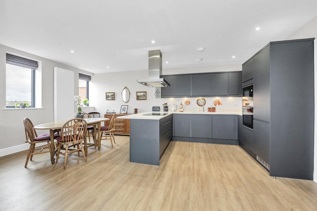 Entrance door into hallway with storage cupboard housing the water softener. Further airing cupboard for storage and through to the open plan kitchen / dining / living room area with full height windows overlooking the front aspect and windows overlooking the side aspect with far reaching views across the east side of Bury St Edmunds. The kitchen is fitted with a modern range of wall and base units and peninsular unit with electric hob and extractor over Double oven and integrated oven and microwave combined, integrated fridge freezer and integrated dishwasher.. Space for dining table and open to the spacious sitting area.