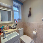 CLOAKROOM Convenient cloakroom with laminate flooring, WC, sink, and a frosted window.
