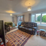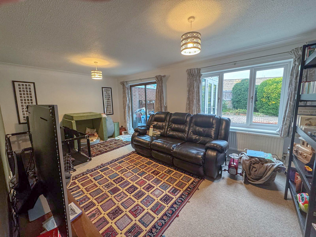 LIVING ROOM Spacious living room featuring carpeted flooring, a large rear-facing window, and sliding doors opening into the conservatory.