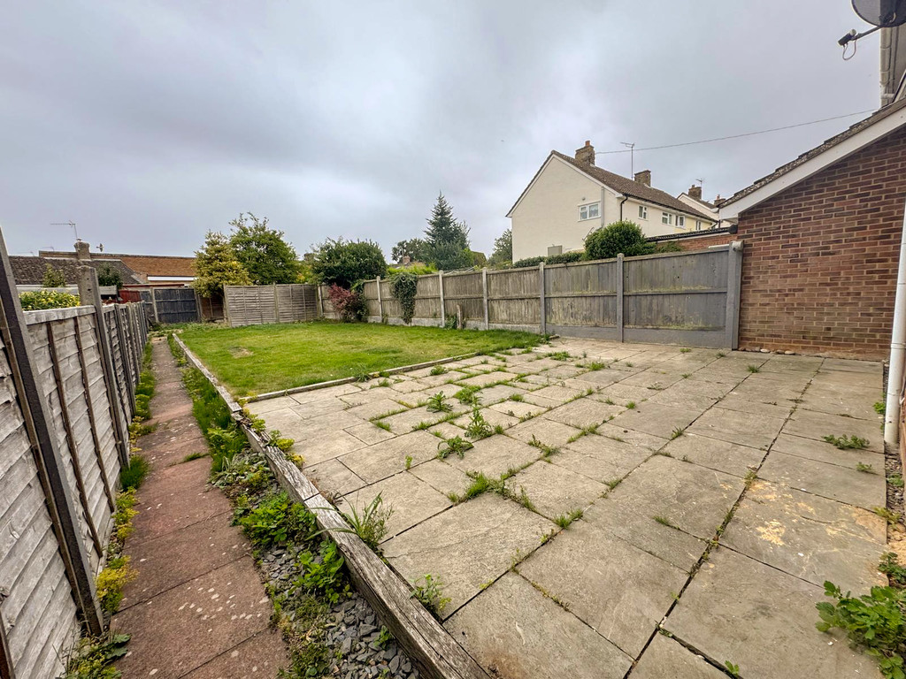 EXTERIOR Expansive enclosed rear garden with lawn and patio areas. Side gate access to the front of the property, which features a large driveway providing off-road parking for four or more vehicles.