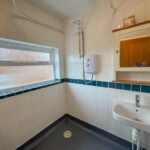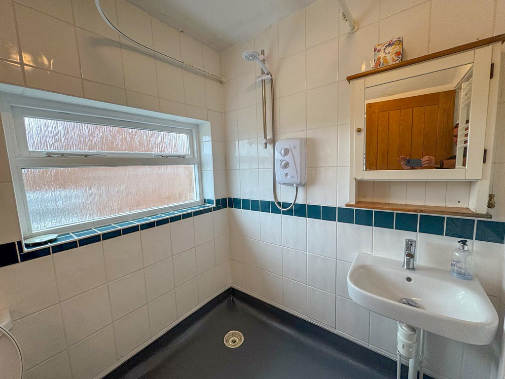 BATHROOM Wet room comprising a shower, WC, and wash basin.
