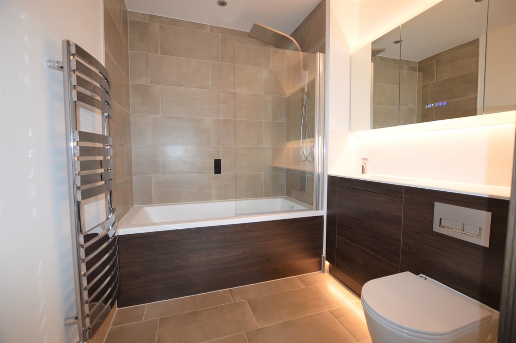 ENSUITE The contemporary bathroom is fitted with a heated towel rail, Fascino digitally controlled Smart Tap, bath with shower over, Smart Mirror with LED lighting, shaver socket, digital clock, and demisting function, as well as a soft-close lid WC.