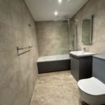 BATHROOM The bathroom features a bath with an overhead shower and shower screen, a basin, and a w/c. The bath area is fully tiled and includes underfloor heating and electric mirror cabinets.